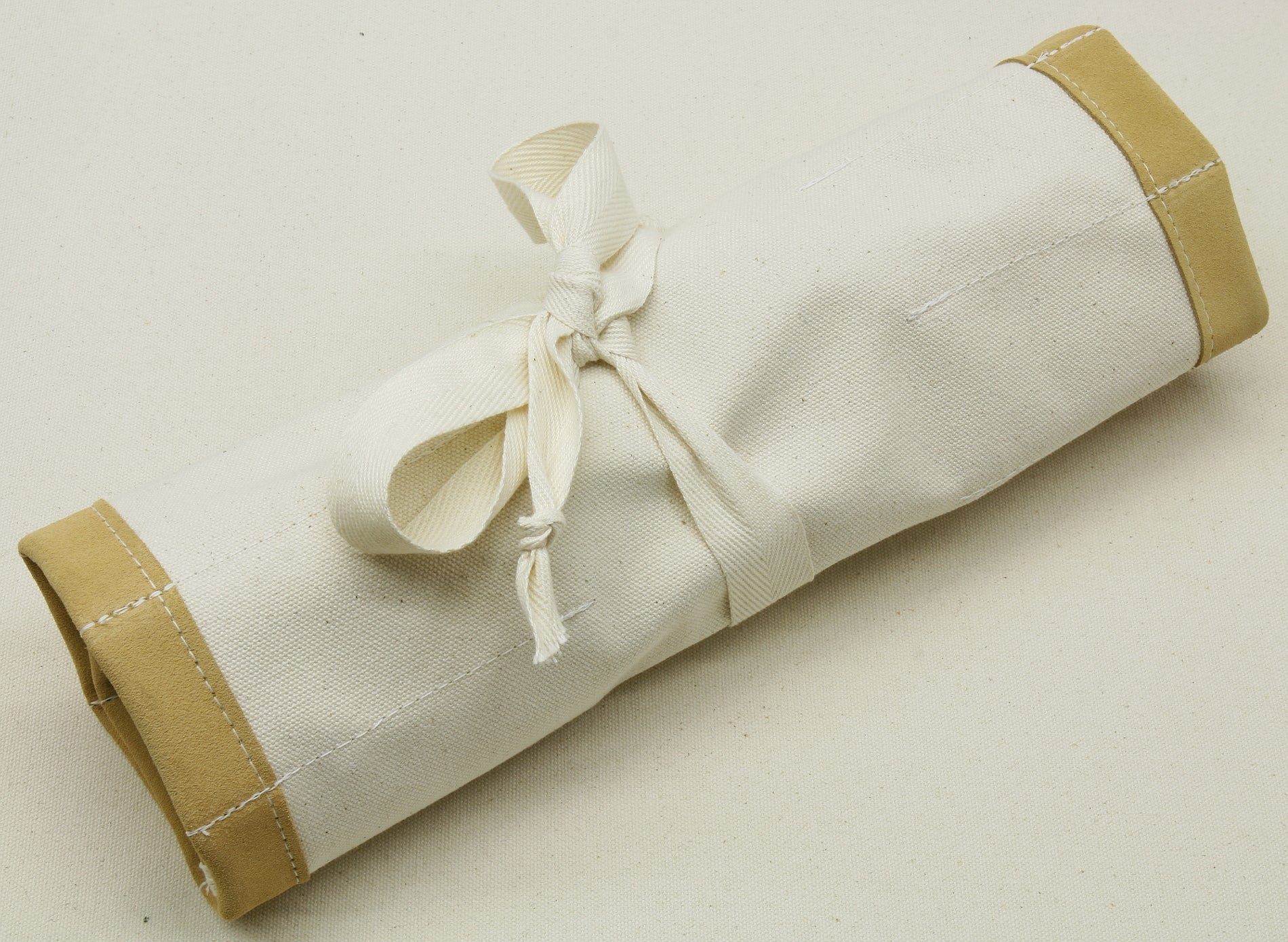 This very versatile canvas tool roll is made from heavy #8 duck canvas with 3oz suede leather reinforcement at the bottom of all pockets. There are seventeen 4 1/2 inch deep tool pockets of various widths. The pockets are staggered from one side to the other for maximum tool loading. Cotton ties secure the tool roll.